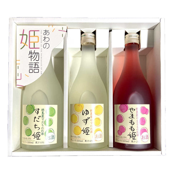 Coffret dégustation de 3 bouteilles de Kajitsusyu, alcool, liqueur traditionnelle à base de fruits du Japon, 8% vol. 3 x 500 ml, très beau coffret avec 3 variétés de Kajitsusyu, variétés de saké aromatisé, sochu aromatisé, pour découvrir cette liqueur traditionnelle aromatisée et authentique japonaise. Marque Nisin.