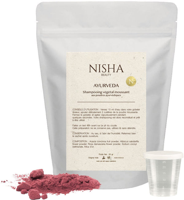 Shampoing végétal moussant Ayruveda, Nisha Beauty, écologique, 50 g, idéal pour cheveux gras, shampoing en poudre à diluer dans l’eau.